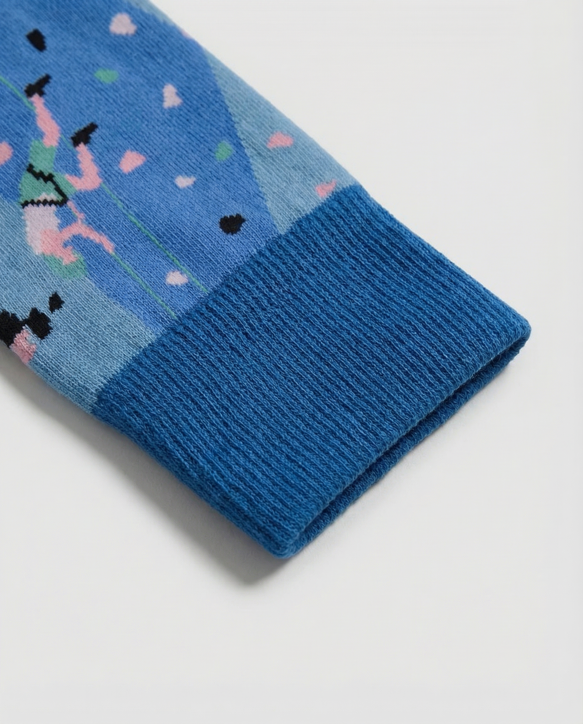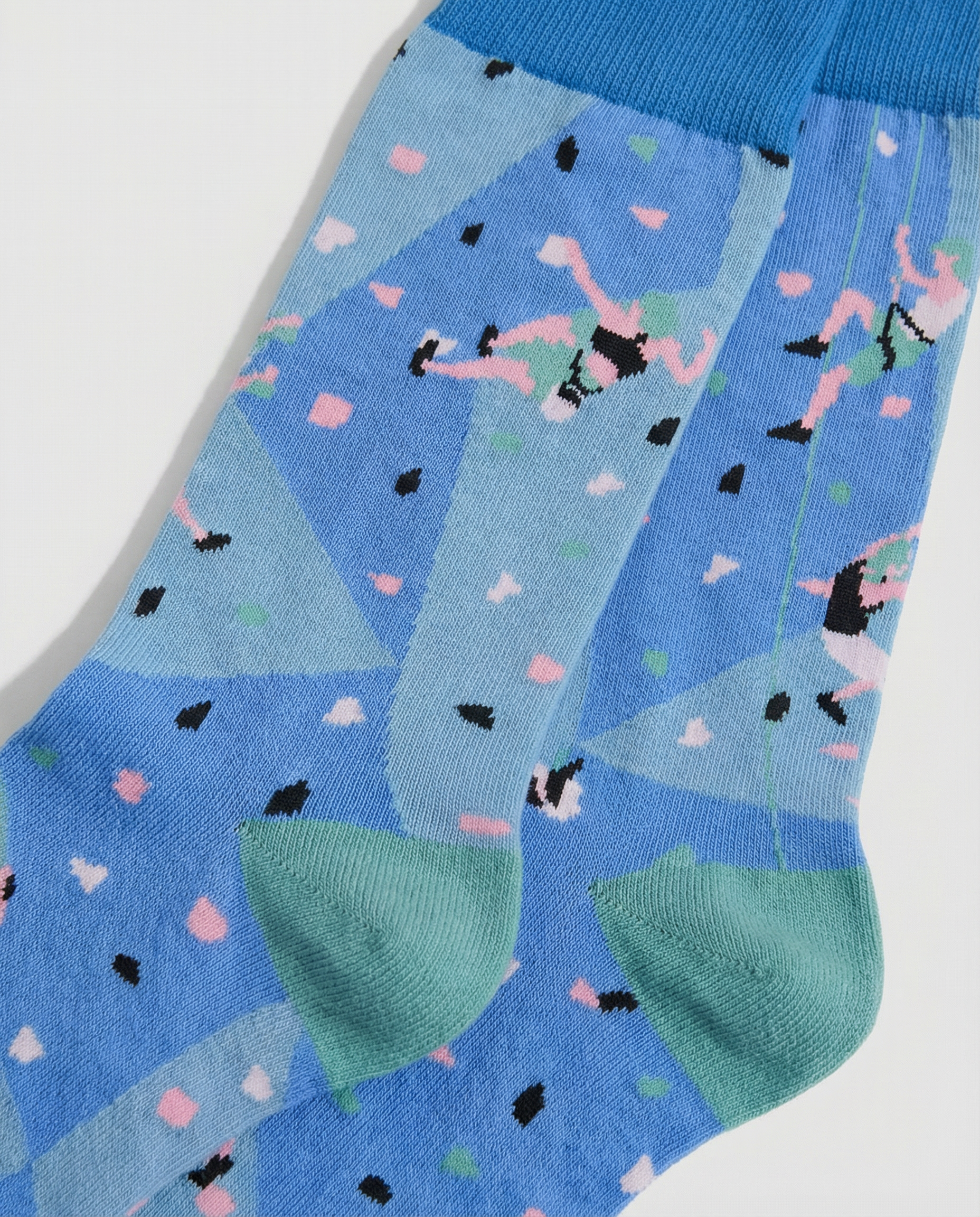 Calcetines divertidos azules con estampado de escaladores, vista frontal