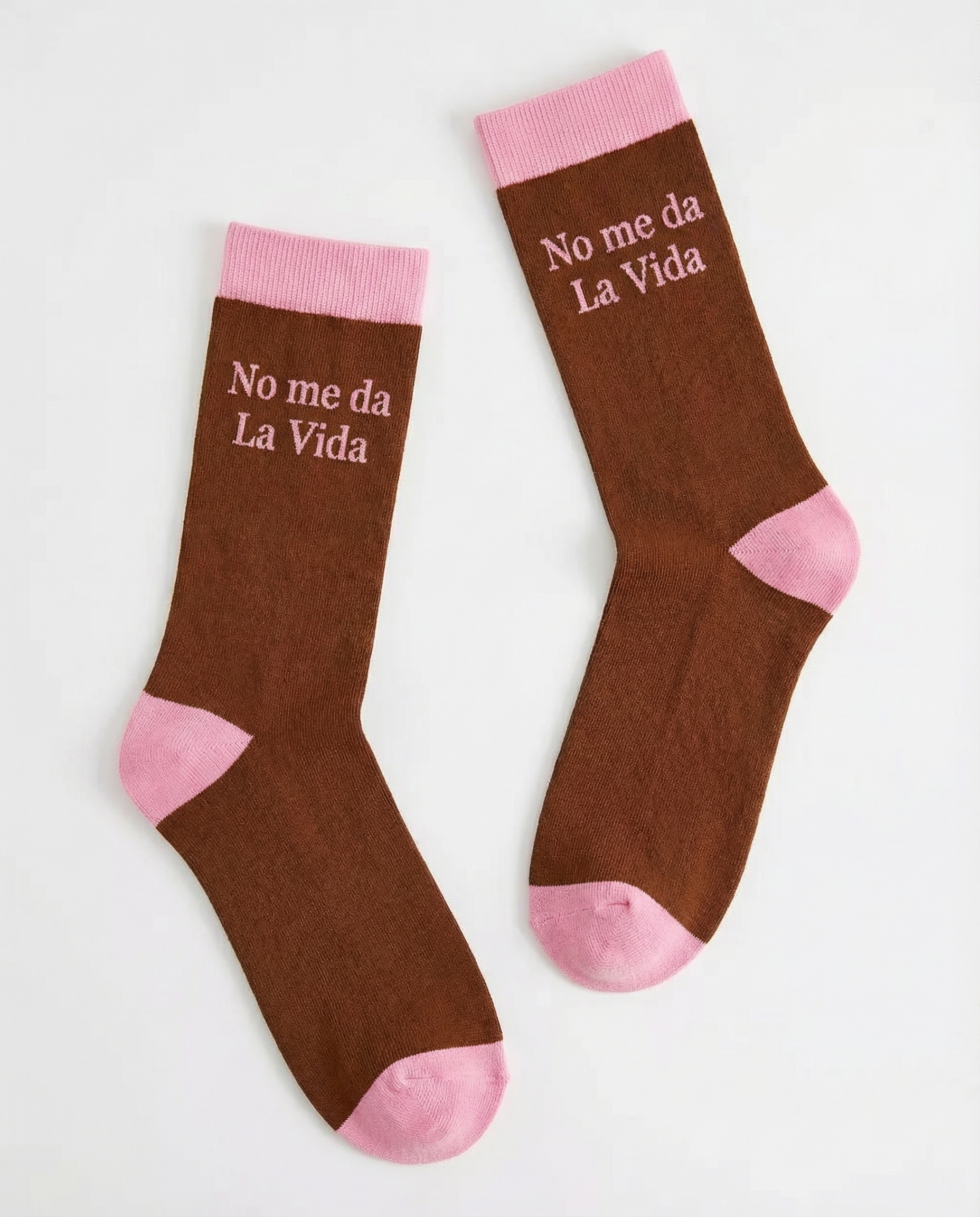 Detalle de la frase bordada “No me da la vida” en calcetines marrón y rosa