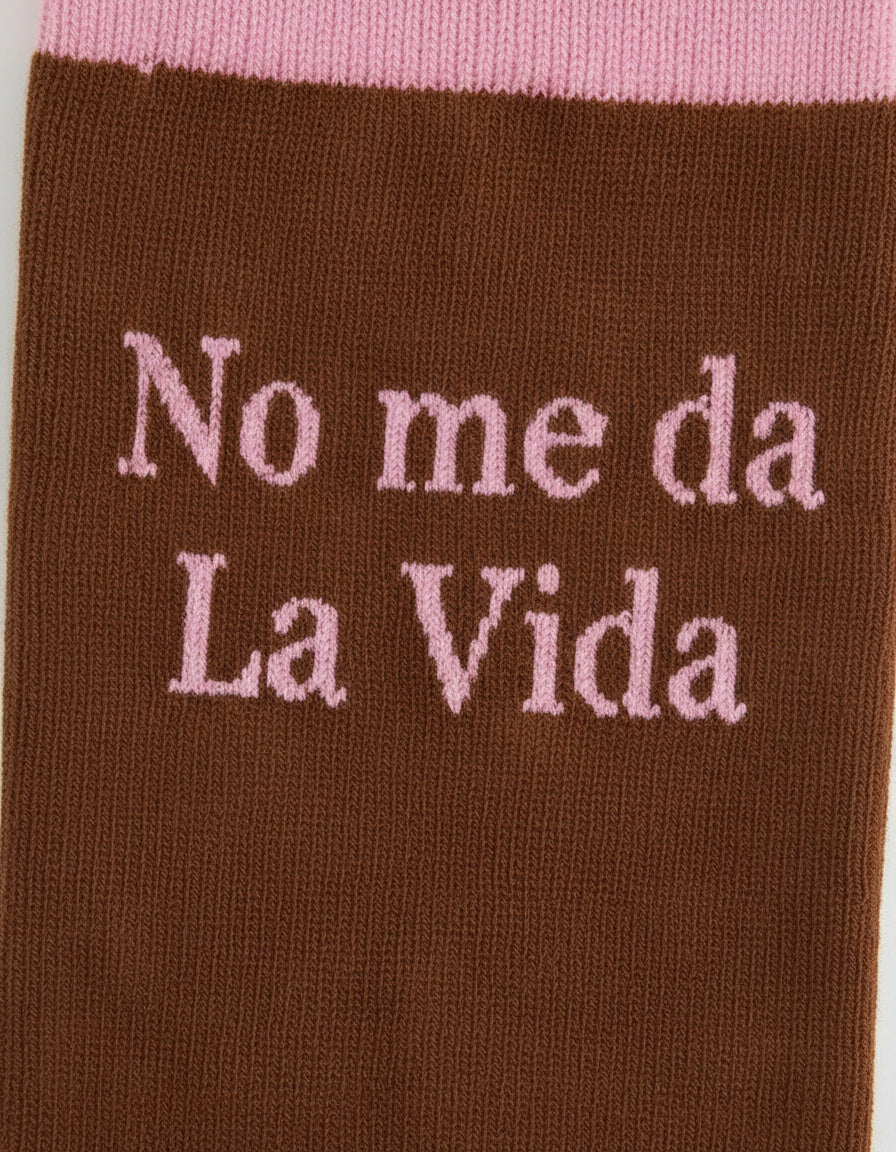 Calcetines deportivos marrón con detalles en rosa y frase “No me da la vida” de Ciccia Socks