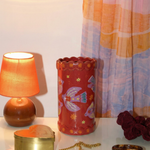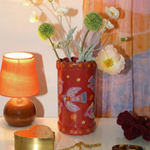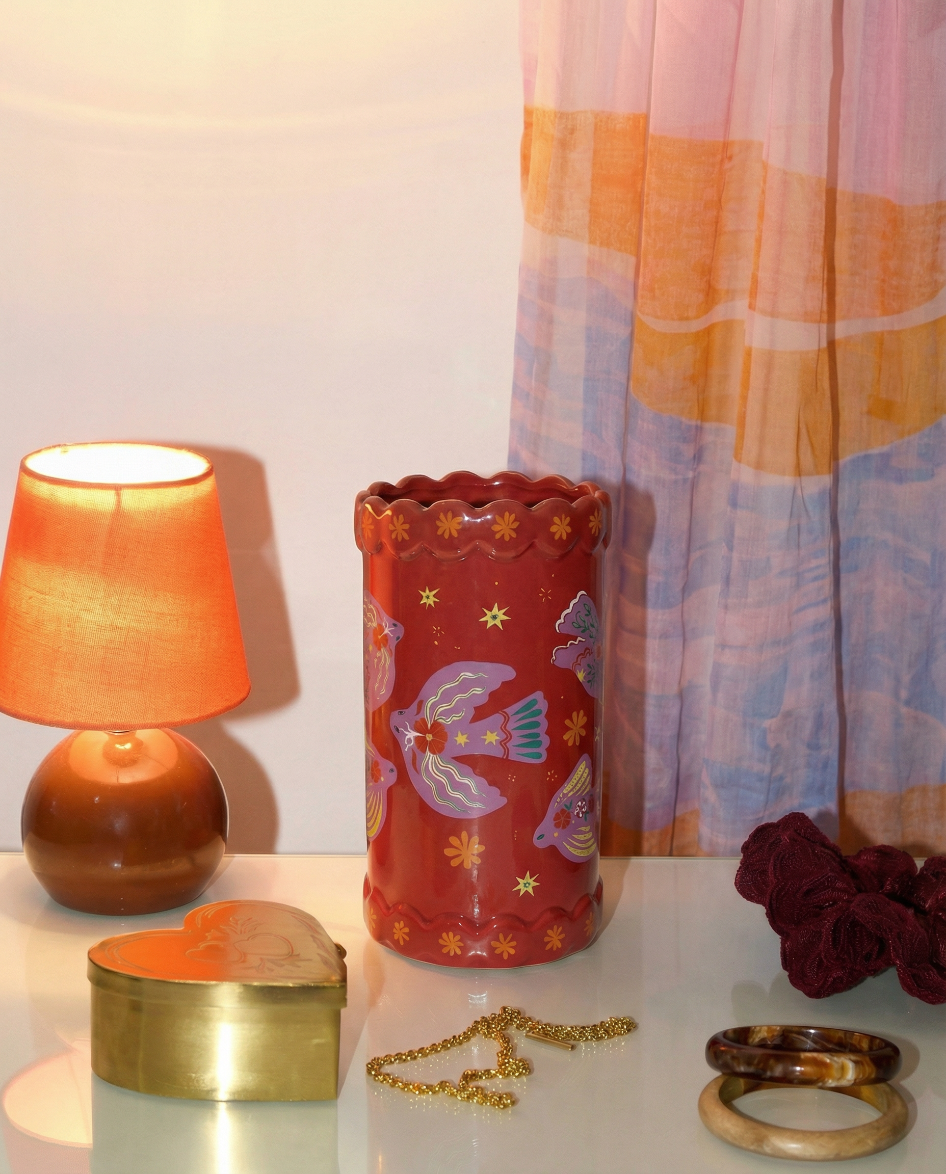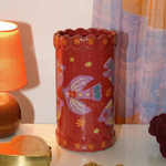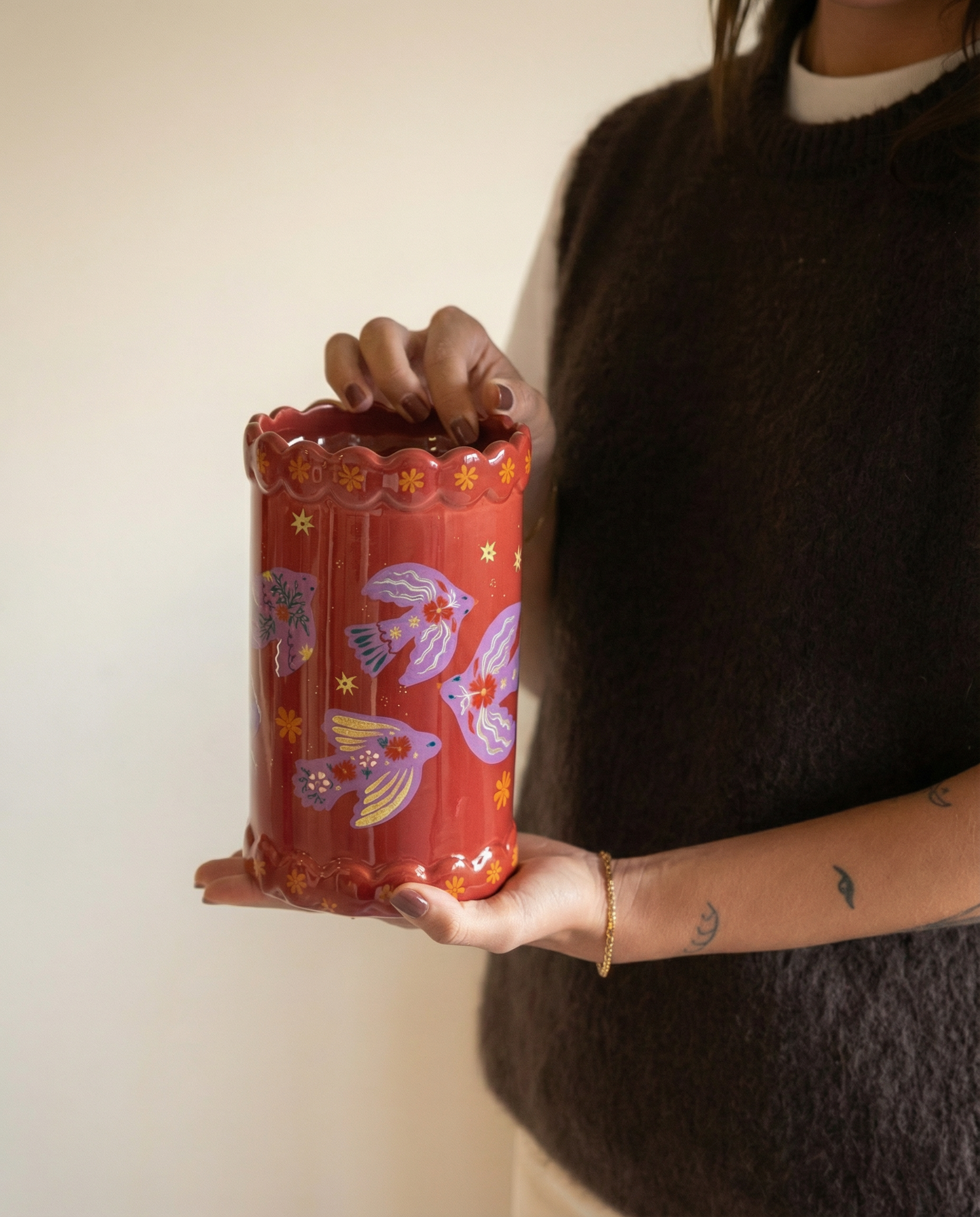 This vibrant red, hand-painted ceramic vase stands out for its pastel-hued bird illustrations with floral details, evoking a dreamlike universe.