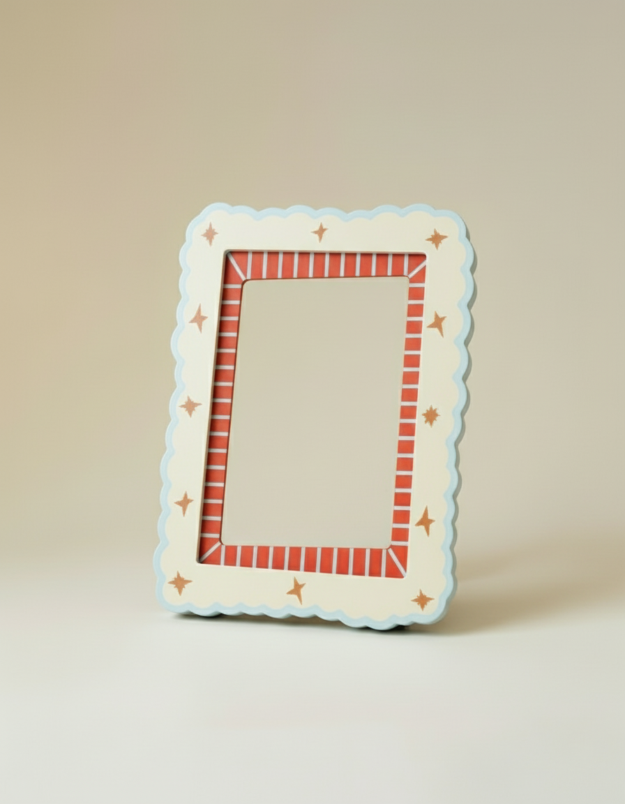 Marco de fotos decorativo de MDF en tonos crema y azul con borde rojo, vista frontal.