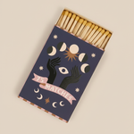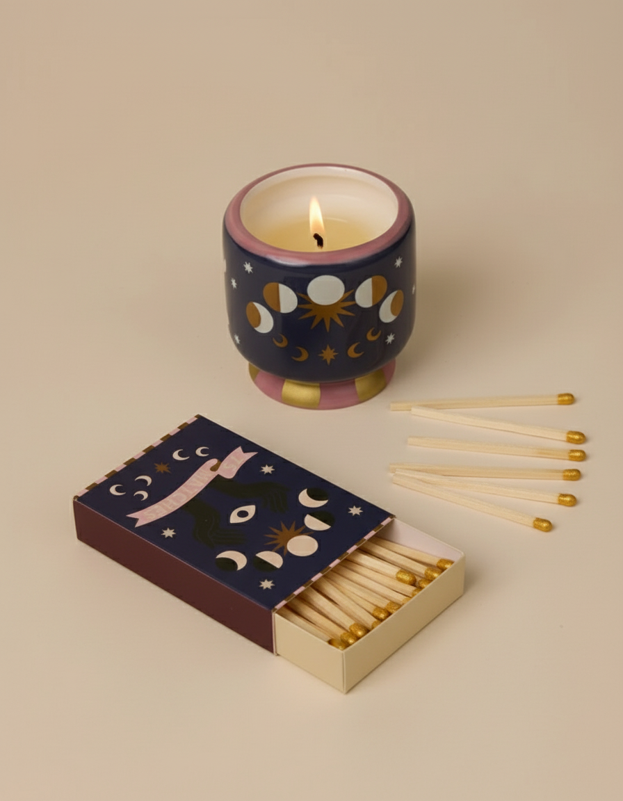 La caja de cerillas A Dopo! destaca por su diseño ilustrado con fases lunares, estrellas y manos místicas en tonos azul oscuro, rosa y dorado. Contiene 75 cerillas de seguridad de 9,7 cm, ideales para encender velas, incienso o simplemente decorar con estilo.