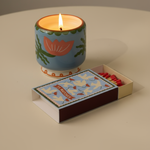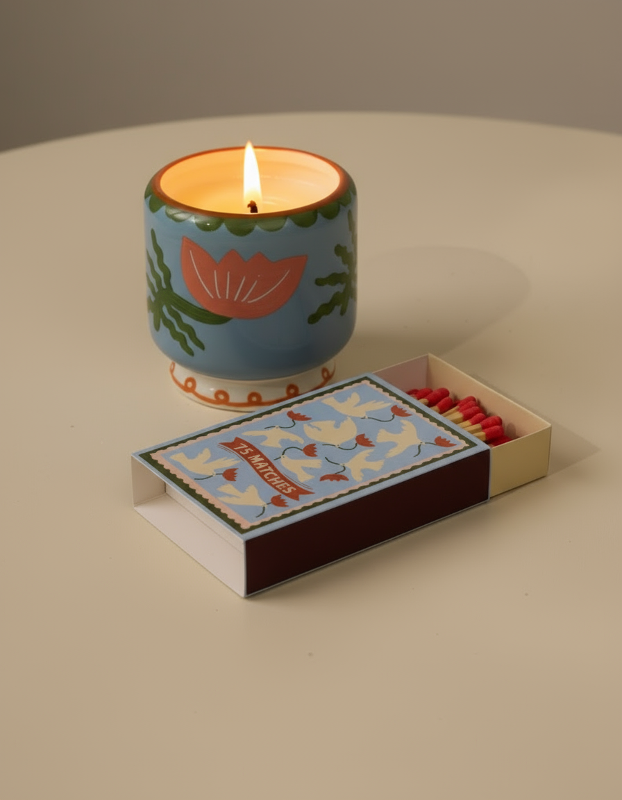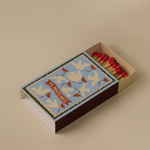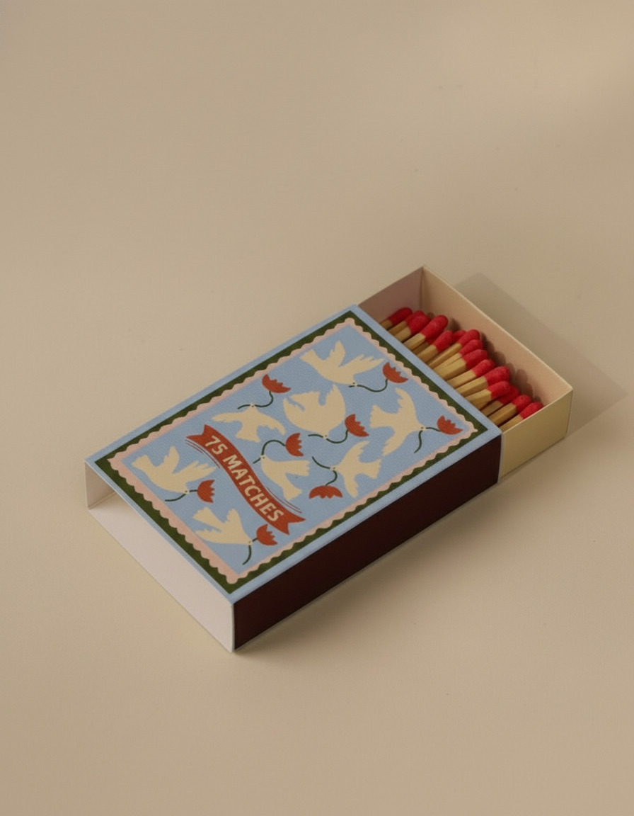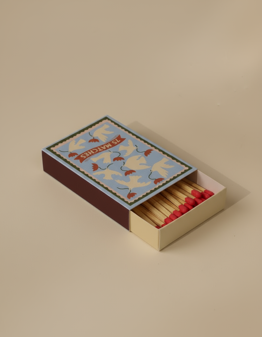 Caja de cerillas ilustrada con un diseño elegante y con aire retro, destaca por su diseño ilustrado en tonos azul, crema y coral. Contiene 75 cerillas largas de 9,7 cm con cabeza roja.