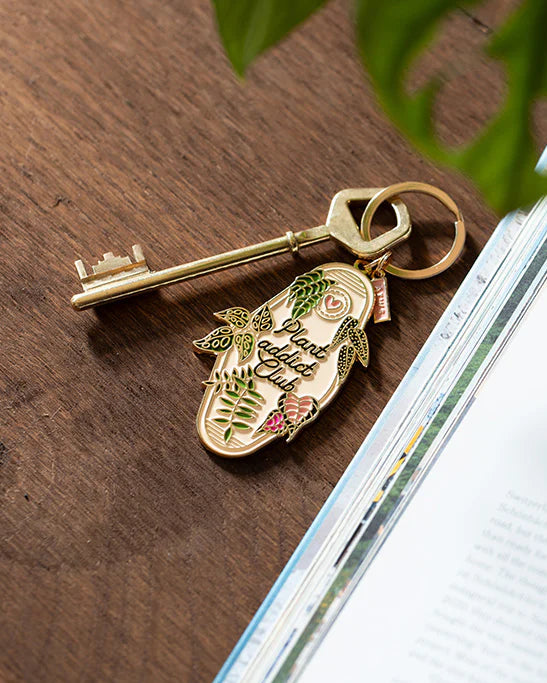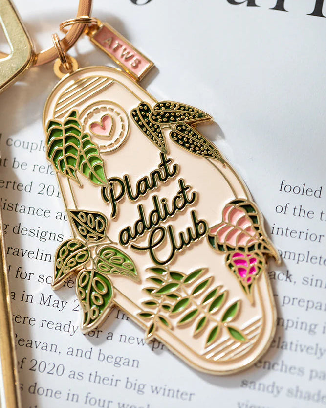 El llavero Plant Addict Club de All The Ways To Say es el accesorio perfecto para quienes viven rodeados de plantas. Su diseño esmaltado combina tonos verdes y rosas sobre una base dorada brillante, con el mensaje “Plant Addict Club” grabado en el centro.