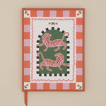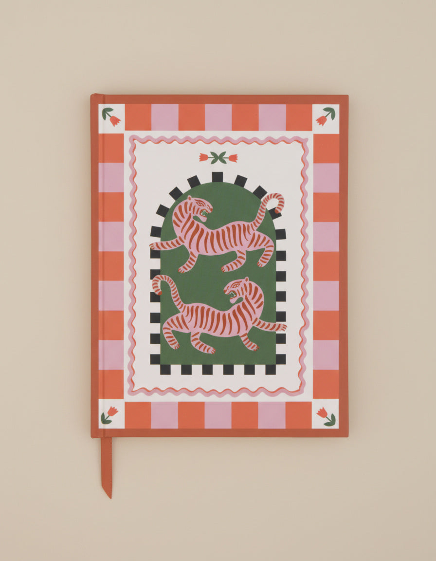 Este cuaderno con ilustración de tigres rosa sobre un fondo verde y marco geométrico es la pieza perfecta para aportar un toque original y retro a tu escritorio.