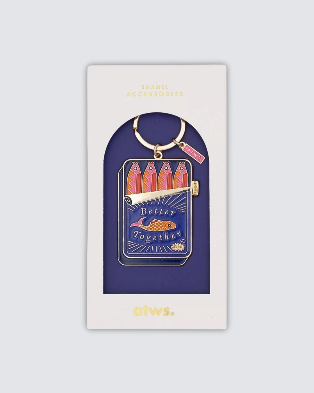 El llavero Better Together de All The Ways To Say combina humor y diseño en una original lata de sardinas esmaltada en azul y rosa con detalles dorados. Fabricado en metal chapado en oro, destaca por su acabado brillante y su estilo retro.