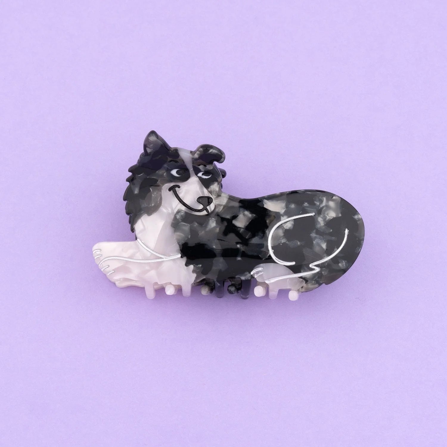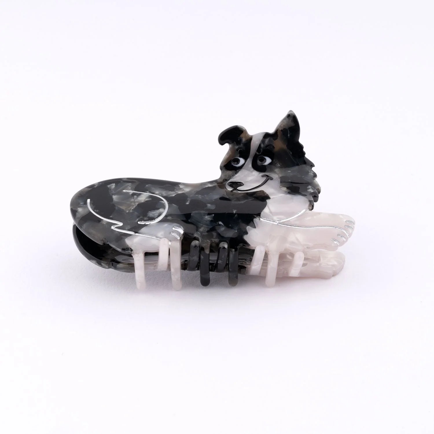 Esta pinza para el pelo con forma de perro border collie es pura ternura y estilo. Fabricada en acetato de celulosa, combina tonos blancos, negros y grises en un efecto marmolado brillante que aporta textura y originalidad.