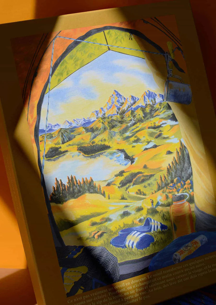 Descubre la calma de la naturaleza con este puzzle francés de 1000 piezas “Chambre avec vue”, una ilustración que nos transporta a un amanecer en la montaña visto desde el interior de una tienda de campaña.
