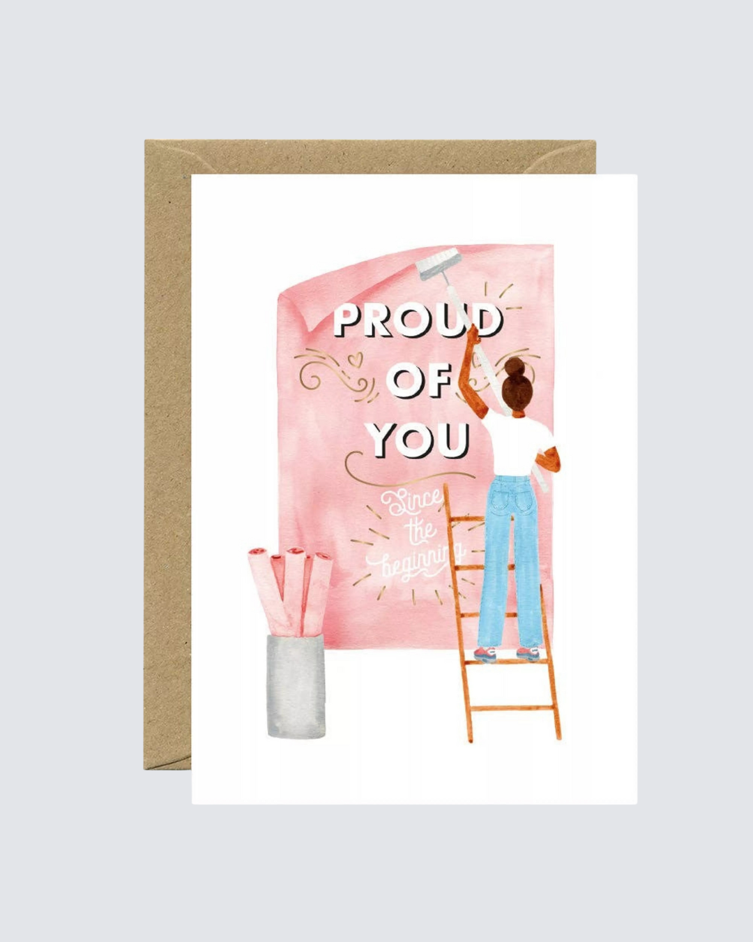 A veces las palabras justas pueden cambiarlo todo. Esta tarjeta ilustrada muestra a una mujer pintando un mural con el mensaje “Proud of You – Since the beginning”, perfecta para celebrar logros grandes o pequeños: un nuevo trabajo, un proyecto personal o simplemente recordarle a alguien que estás orgulloso de su camino.