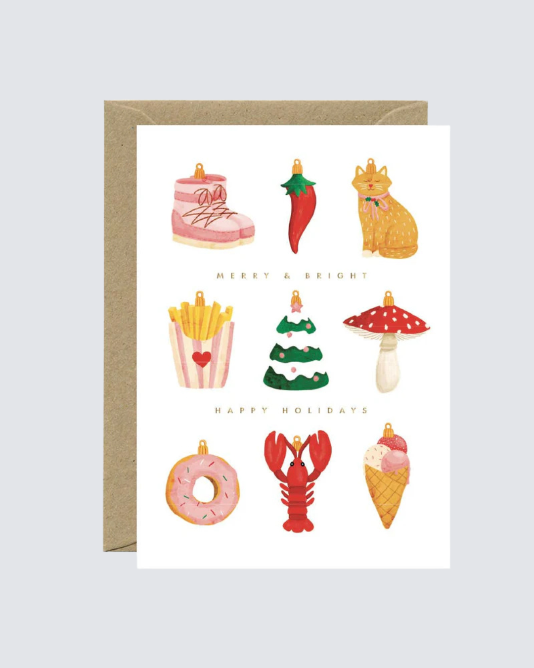 Postal Merry & Bright con ilustraciones navideñas originales: donut, árbol, gato y más. Impresa en papel mate de alta calidad e incluye sobre kraft. Ideal para acompañar tus regalos o enviar felicitaciones con estilo.