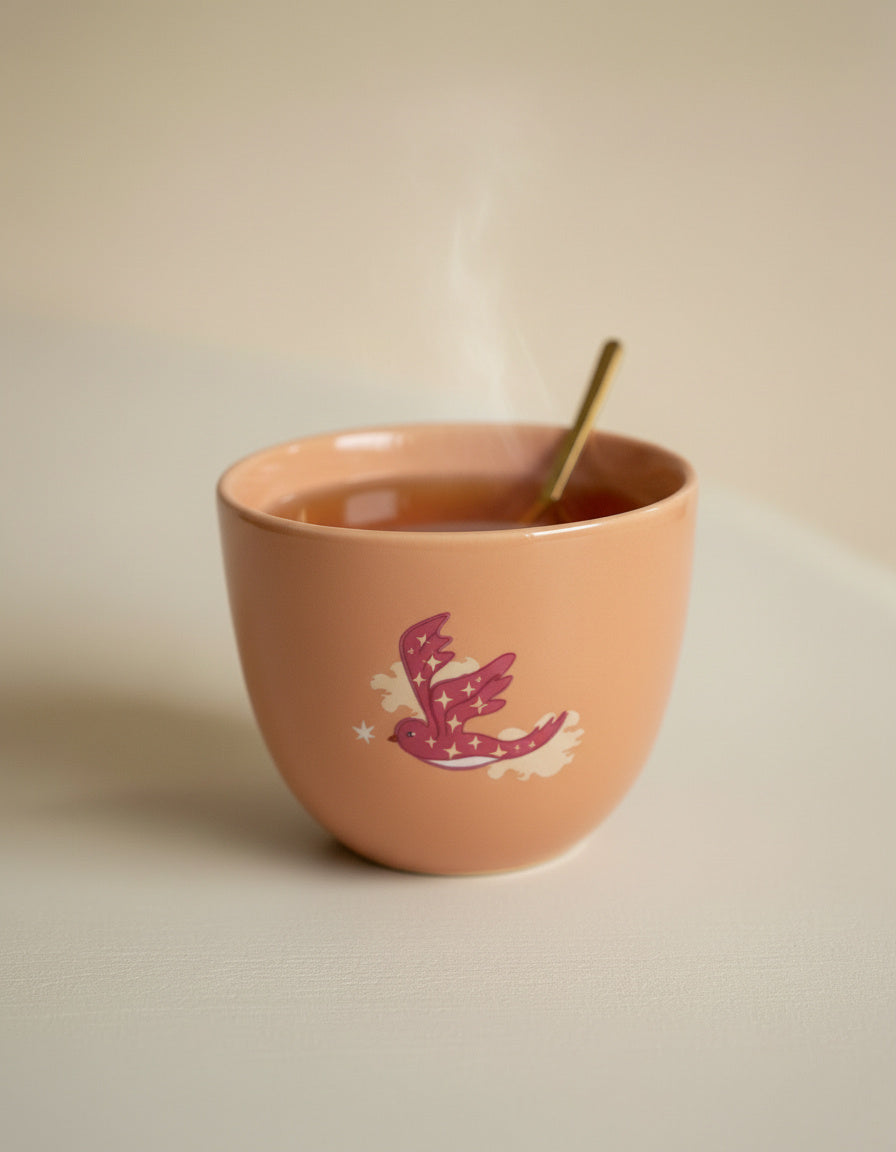 Una taza para volar con la imaginación. Esta pieza de cerámica esmaltada en tono melocotón destaca por su ilustración de un pájaro rosa con alas estrelladas, rodeada de nubes y una pequeña estrella. Un diseño lleno de encanto y simbolismo, ideal para amantes del arte y la estética mágica.