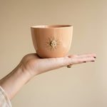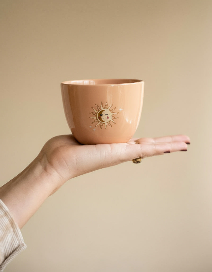 Disfruta de tus momentos de calma con esta taza de cerámica color terracota con diseño de sol. Su estilo artesanal y su tono cálido aportan un aire mediterráneo y relajado a tu mesa.