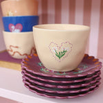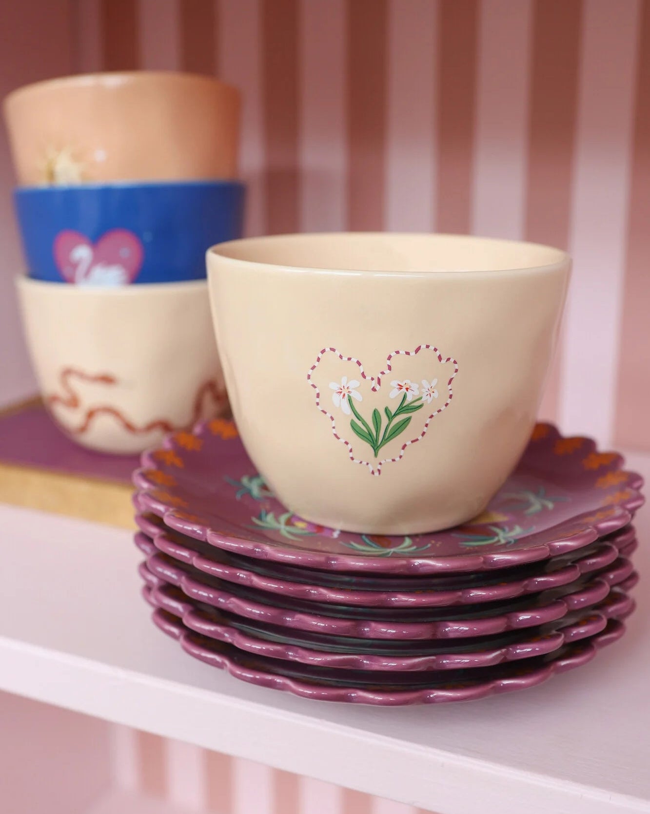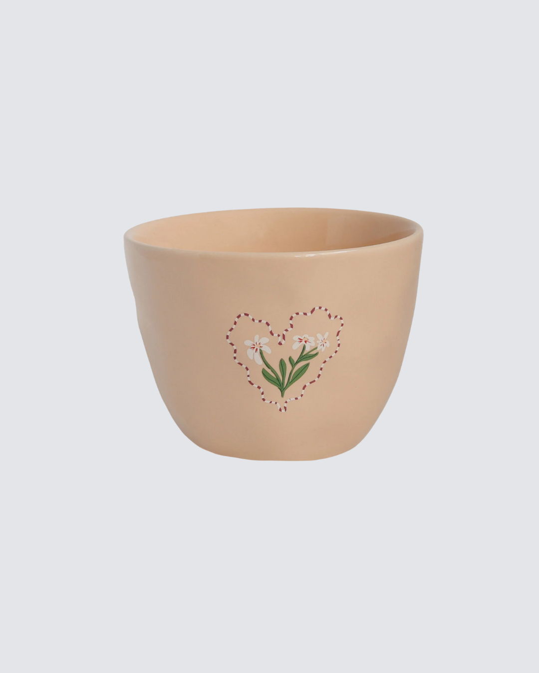 Endulza tus momentos de relax con esta taza de cerámica color arena decorada con un corazón de flores. Su diseño artesanal, con delicados tonos naturales y detalles pintados a mano, aporta un aire romántico y veraniego a tu mesa.
