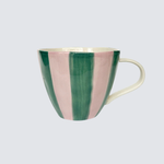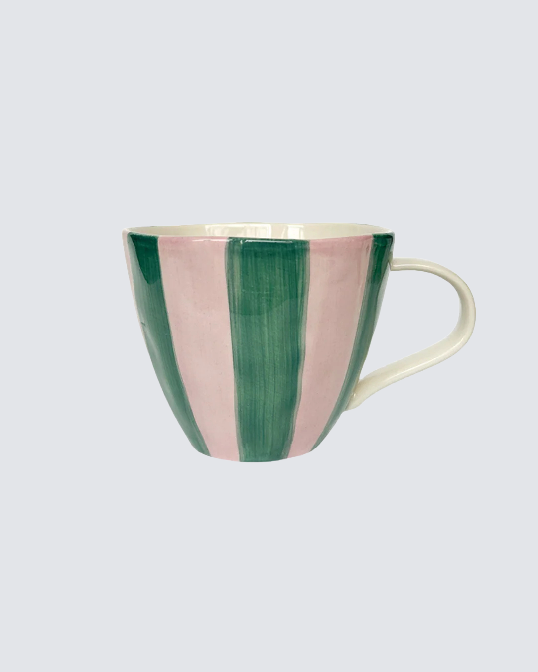 Taza de cerámica esmaltada con diseño de rayas anchas en tonos rosa pastel y verde bosque, ideal para añadir un toque retro y alegre a tu cocina. Su acabado brillante, pinceladas visibles y forma redondeada hacen de esta pieza una joyita para el día a día.