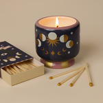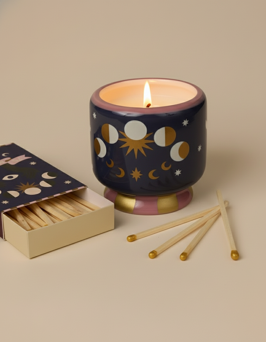 Vela aromática de 226 g elaborada con cera de soja sostenible, presentada en un recipiente de cerámica pintada a mano con un diseño celestial de fases lunares, soles y estrellas en tonos dorado, blanco y rosa. Una pieza decorativa perfecta para amantes de lo místico y lo cósmico.