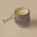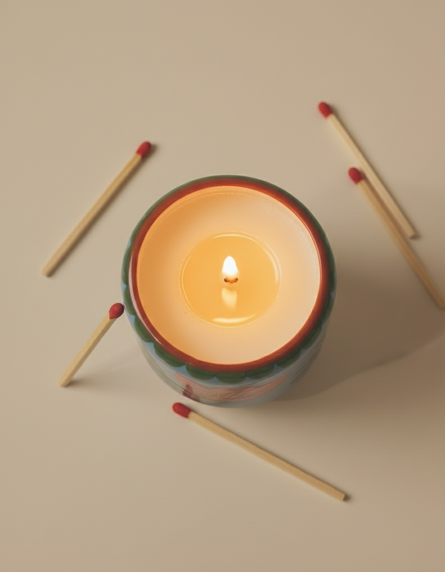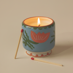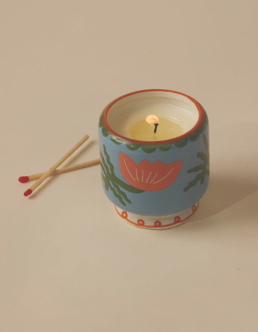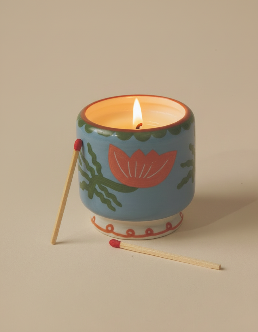 Ilumina tu hogar con esta vela aromática de soja en cerámica pintada a mano con un diseño floral bohemio en tonos azul, coral y verde. Hecha con cera de soja 100% natural y una fragancia envolvente, esta vela no solo aporta luz y aroma, sino que también se convierte en una pieza decorativa única. Su recipiente en cerámica es reutilizable, perfecto para darle una segunda vida como maceta, porta-lápices o pequeño joyero. Ideal para quienes buscan un toque aesthetic en su espacio.